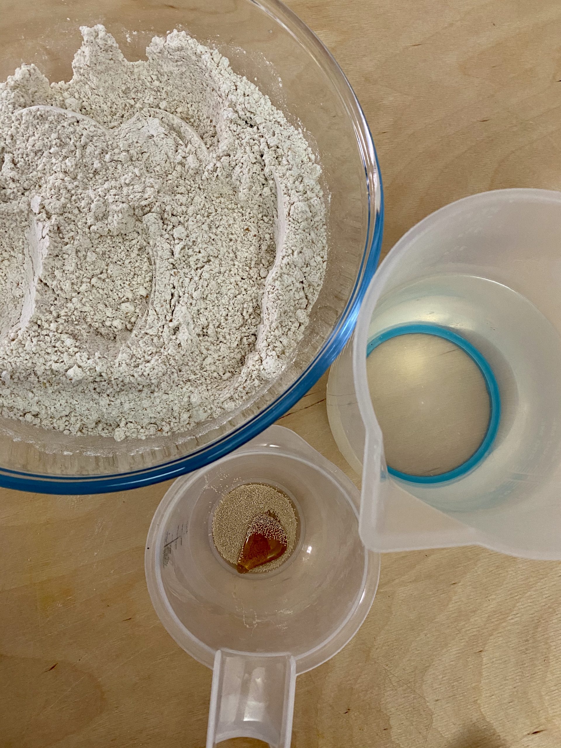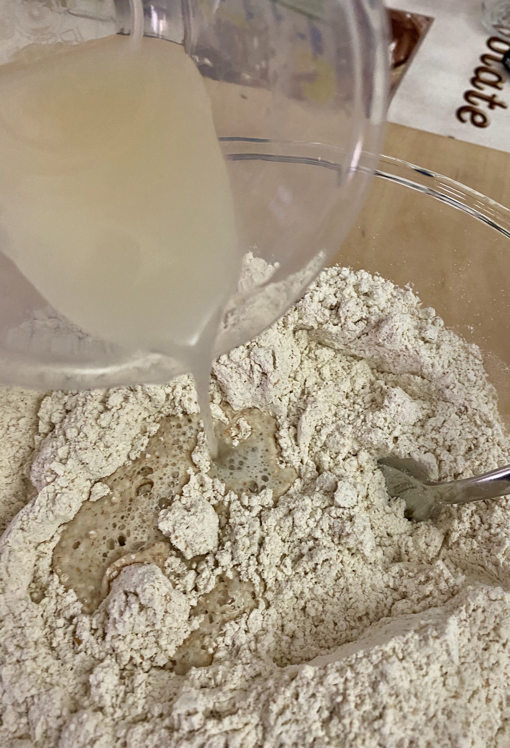 In una ciotola mescolare tutte e tre le farine e aggiungere a filo l’acqua.
