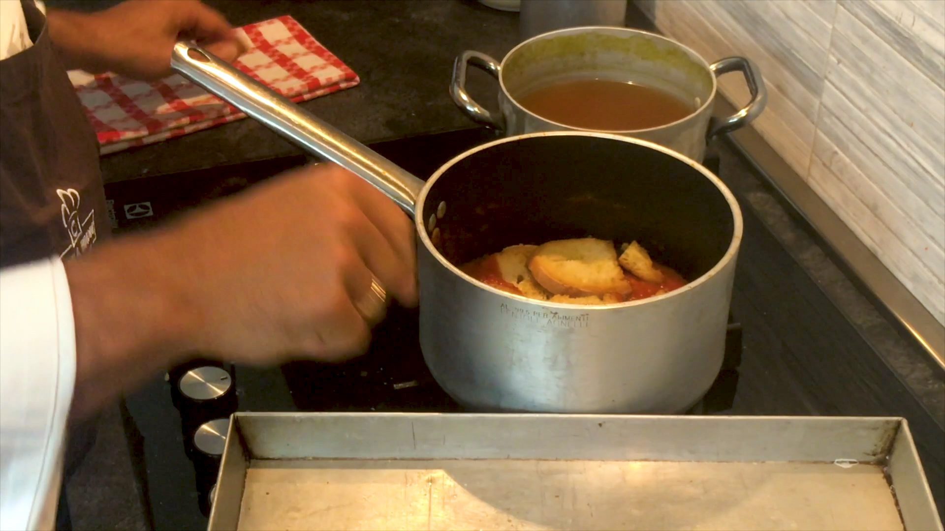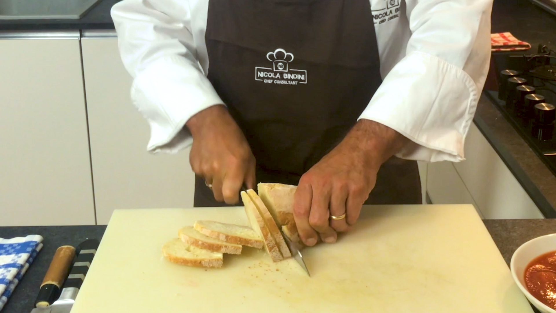 Quando la salsa si sarà ristretta aggiungere le fette di pane arrostite alla salsa di pomodoro.
