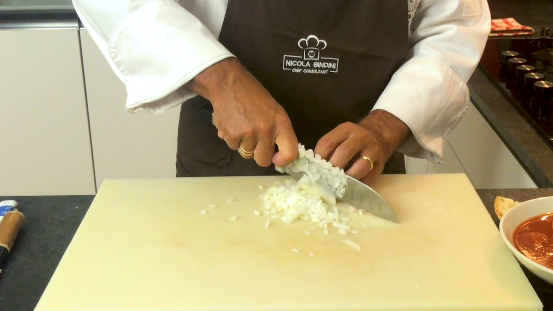 Tritare la cipolla e l’aglio e aggiungerli alla padella pre-riscaldata insieme a dell’olio.