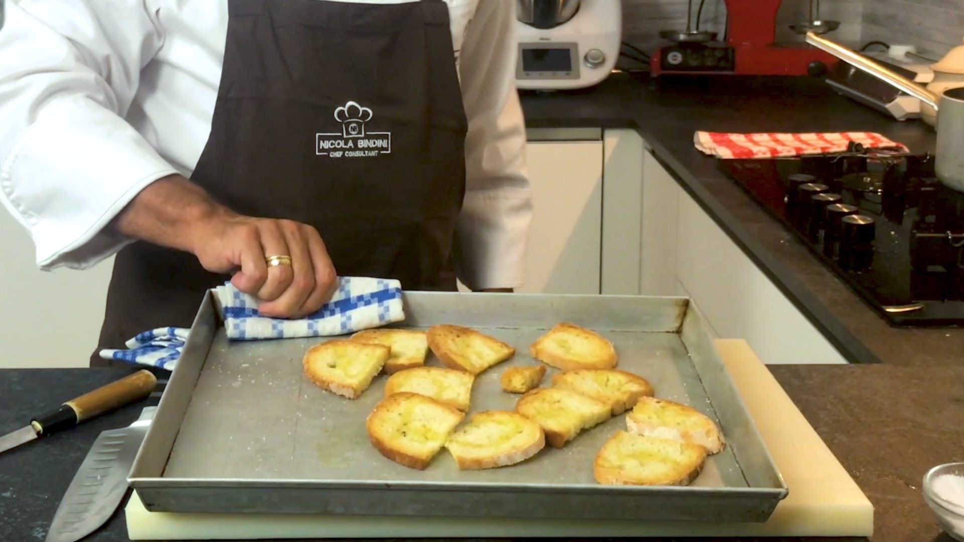 Mettere le fette su di una teglia coperta di carta da forno e condirlo con un po’ di sale e di olio evo.