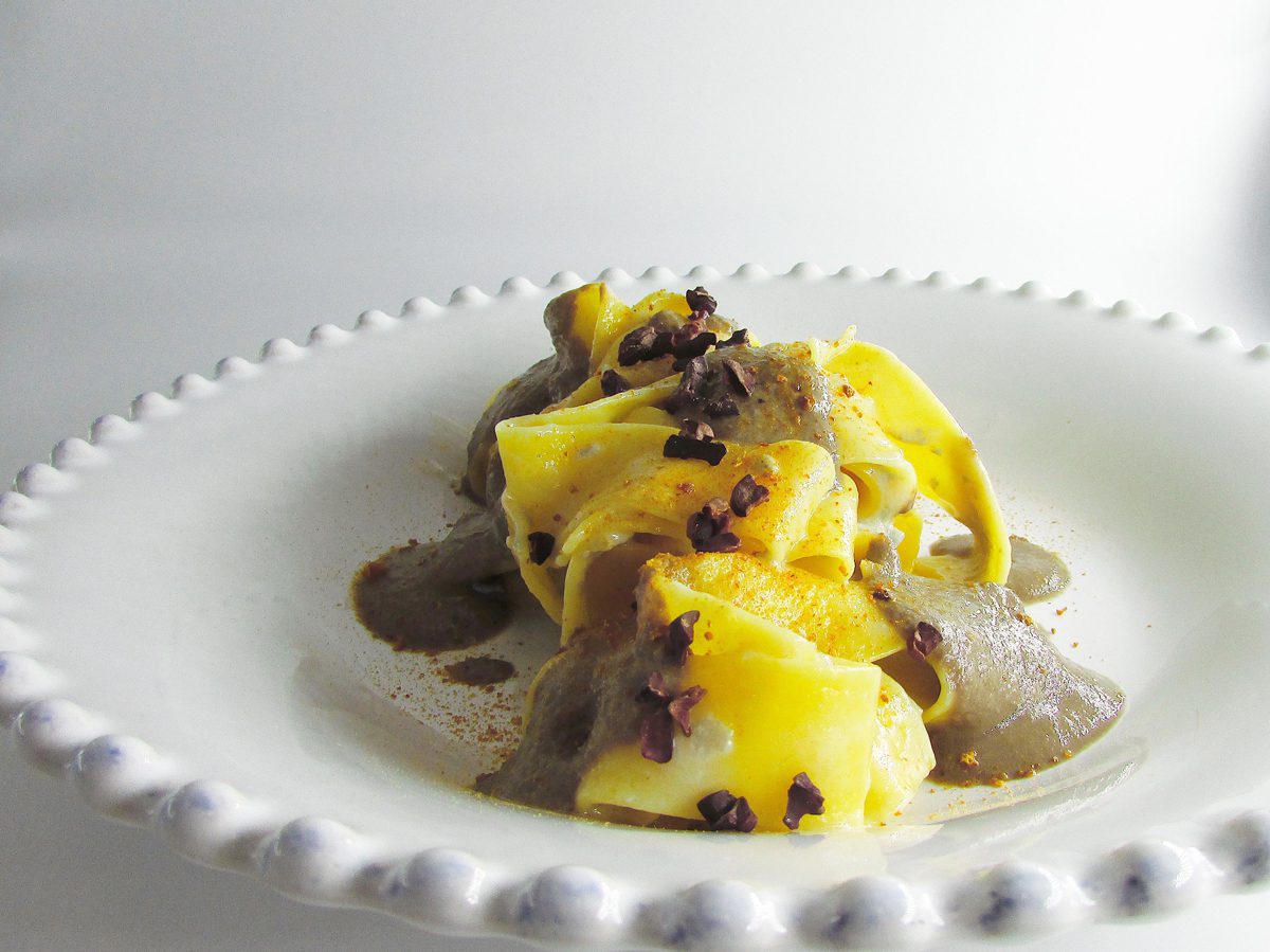 Servire la pasta guarnendola con il paté di fegatini e decorando con le fave di cacao e la polvere di mandarino.