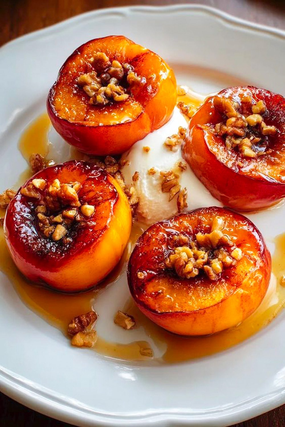 Un dessert semplice che esalta la dolcezza delle pesche con una breve caramellizzazione in padella. Il miele crea uno sciroppo caldo che avvolge il frutto mentre la frutta secca aggiunge una componente croccante. Si può preparare con pesche fresche di stagione oppure con pesche sciroppate.