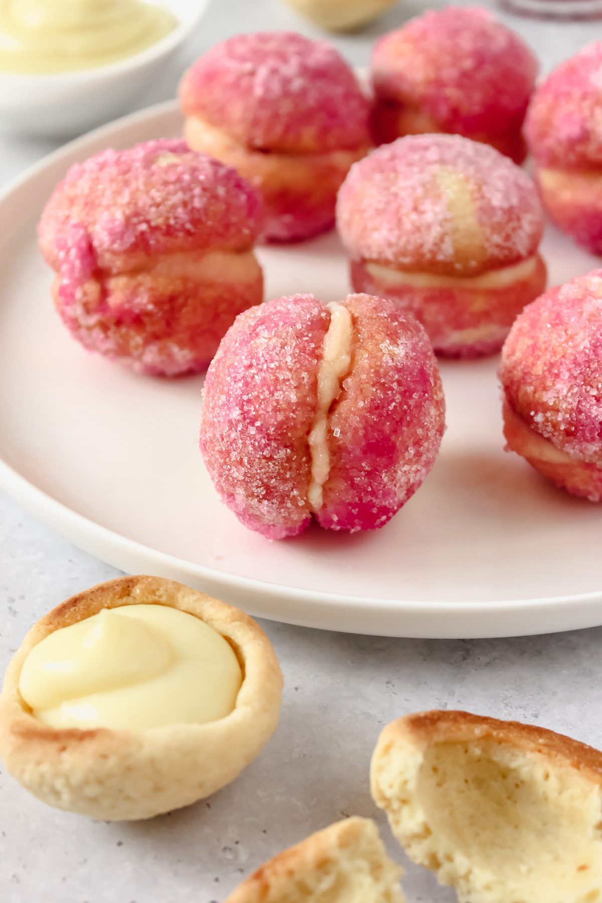Con l’aiuto di una sac a poche riempire ogni guscio con la crema pasticcera, unire due metà e prima passarle in una ciotola con l’alchermes e poi in un’altra ciotola con lo zucchero assicurandosi di coprire bene tutta la superficie.