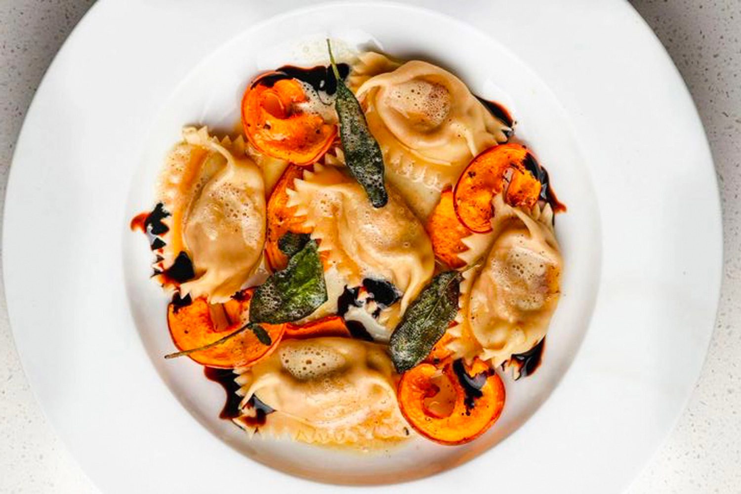Disponi i ravioli nel piatto, aggiungi le fettine di zucca arrosto, qualche foglia di salvia, completa con gocce di riduzione di balsamico.
