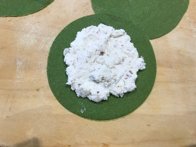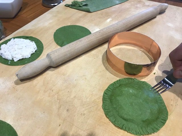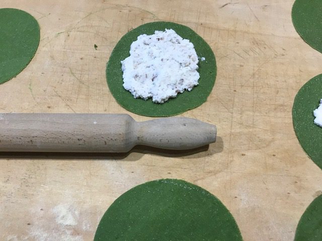 Al centro di ogni disco di pasta porre almeno due/tre cucchiai di impasto, quindi adagiarvi sopra un altro disco di pasta e chiudere i bordi aiutandosi con le dita e con i rebbi di una forchetta.
