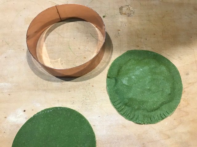 In seguito, con un coppa pasta del diametro di circa 12/15 centimetri ricavare dei dischi dalla sfoglia precedentemente tirata al matterello.
