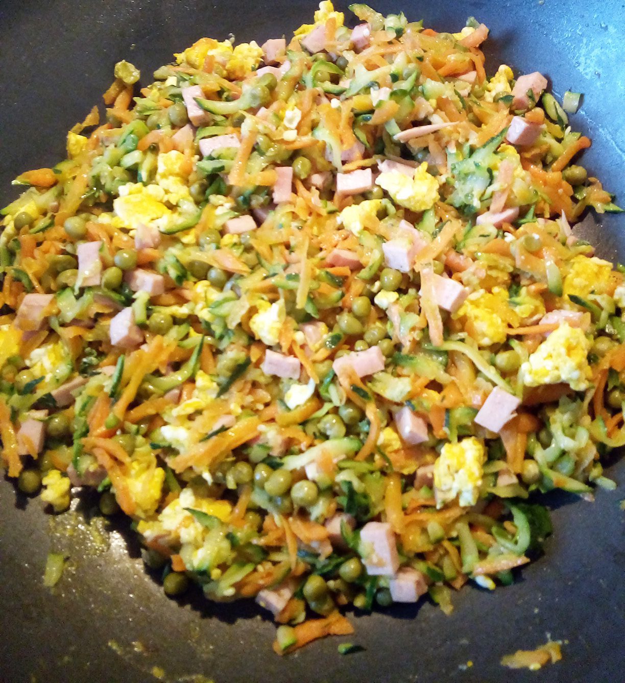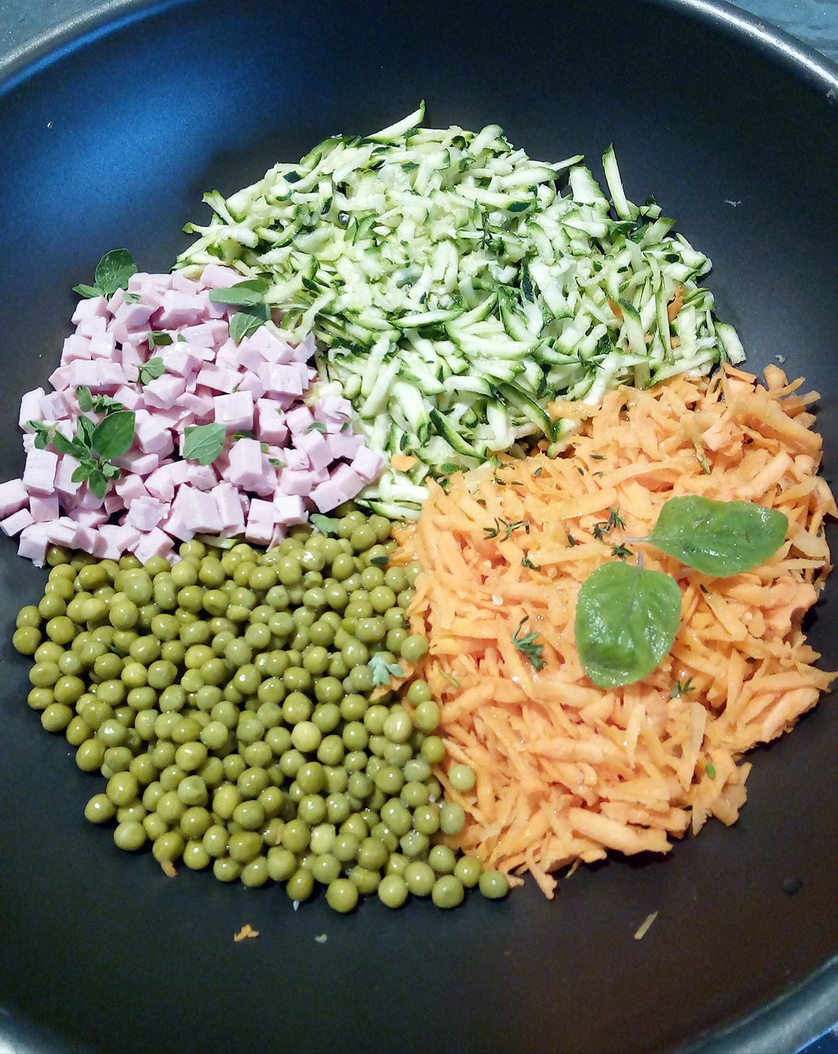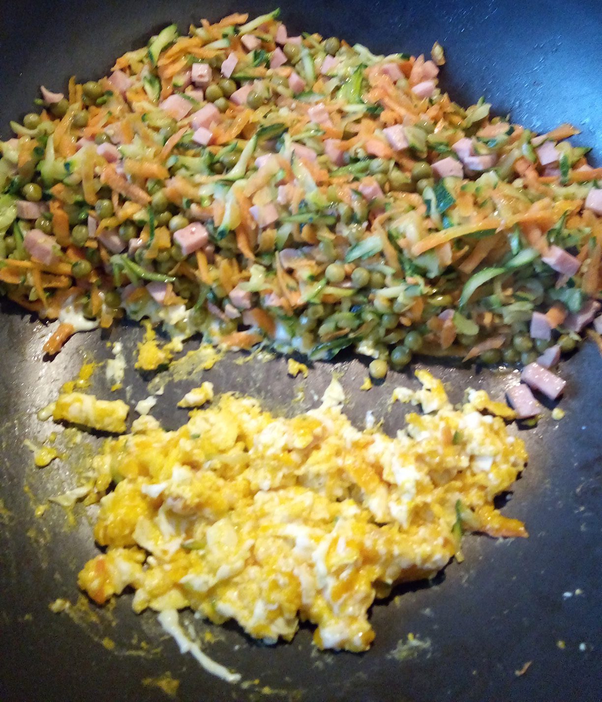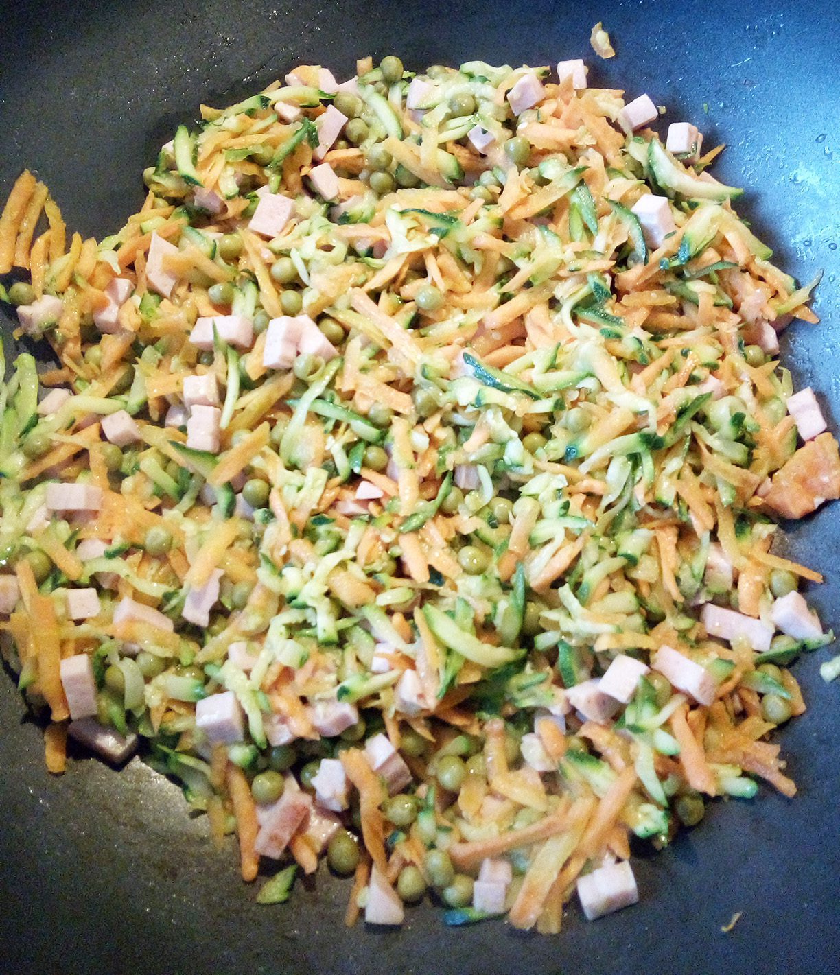 Successivamente, porre tutte le verdure, il prosciutto, le spezie e il sale in un wok per poi fare saltare il tutto con un filo d’olio per 10 minuti circa a fuoco vivo.