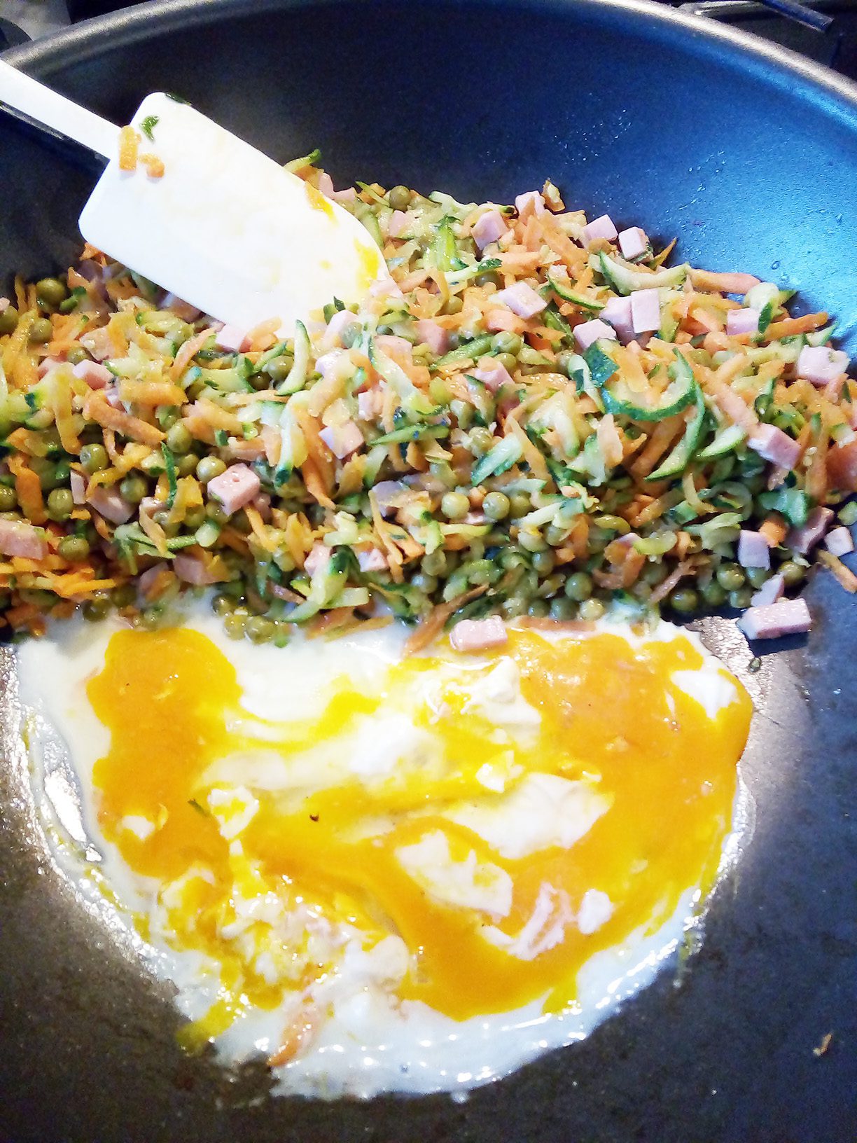Dopo aver abbassato la fiamma, raggruppare le verdure su un lato della pentola, rompere le uova sul lato vuoto, salare e strapazzare velocemente finché non saranno ben rapprese.
