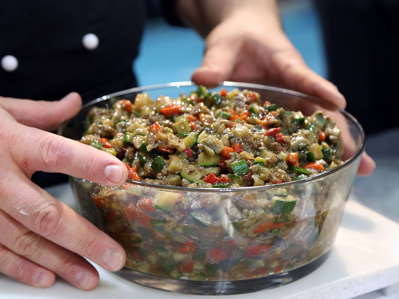 Per iniziare, tagliare le melanzane a cubetti, saltarle in padella e poi farle raffreddare.