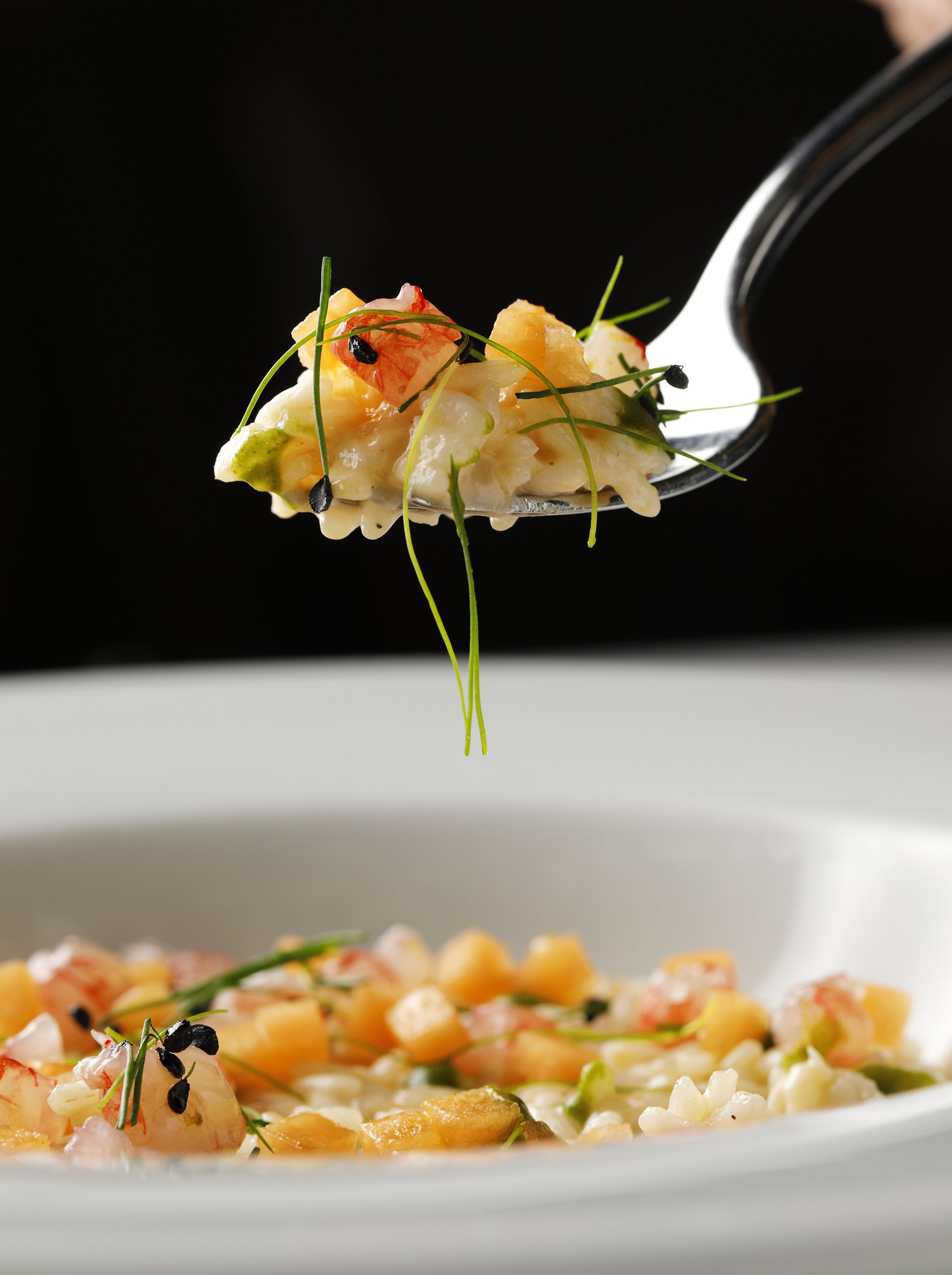 Tagliare a cubetti le mazzancolle e il melone e aggiungere la metà di questi ingredienti al riso quando è a metà cottura.