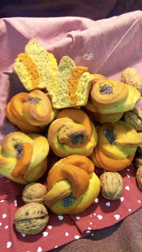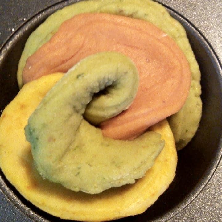 Ideali da servire a centro tavola durante i pasti quotidiani, sono attraenti proprio perché colorati! Questi colori differenti sono dati da ingredienti differenti all’interno dell’impasto, in questo caso il pomodoro, il basilico e lo zafferano.