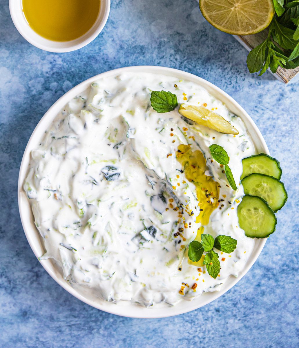 Mettere in una ciotola lo yogurt greco, aggiungere il cetriolo grattugiato, l’aglio e la menta tritati, il succo di limone, l’olio extra vergine d’oliva e del sale e del pepe a piacimento.