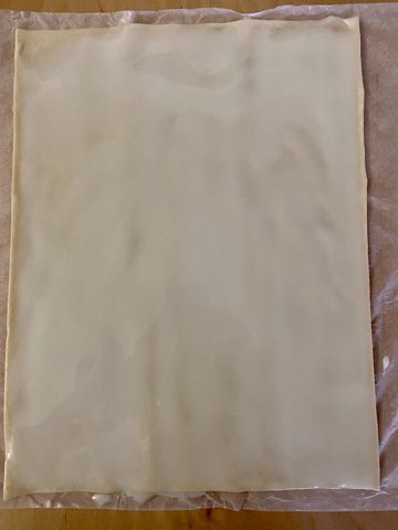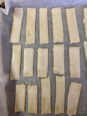 Passata un’ora, togliere la pasta sfoglia dal frigorifero e tagliarla con una rotella per pasta oppure con un coltello, per ottenere delle strisce della grandezza preferita.