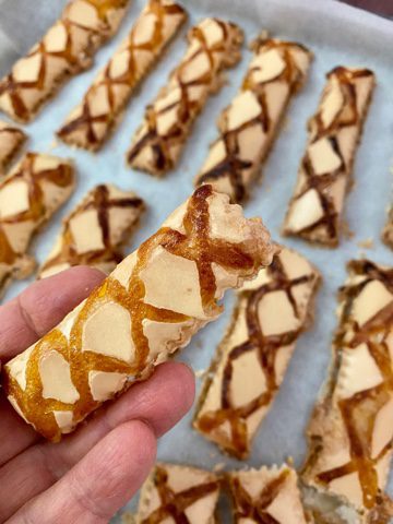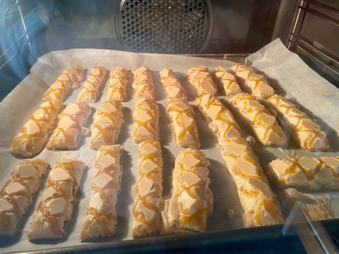 Trasferire le strisce ottenute in una teglia ricoperta di carta da forno, posizionandole leggermente distanziate tra di loro.