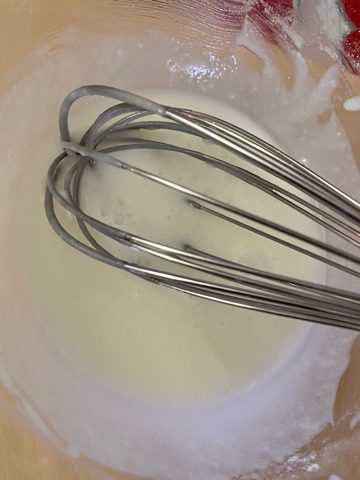 Per prima cosa mescolare l’albume d’uovo con lo zucchero a velo con una frusta fino a ottenere un composto liscio e ben amalgamato, senza grumi.