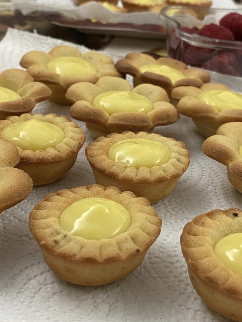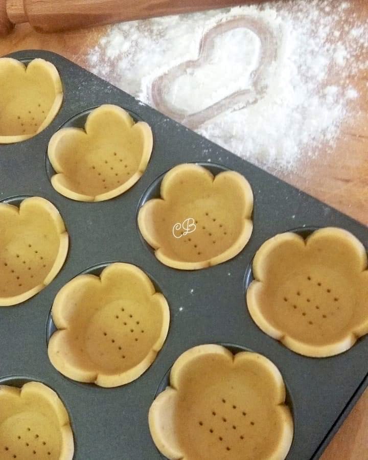 Iniziare con il preparare la pasta frolla per le tartellette. Versare la farina su una spianatoia e creare una fontana.