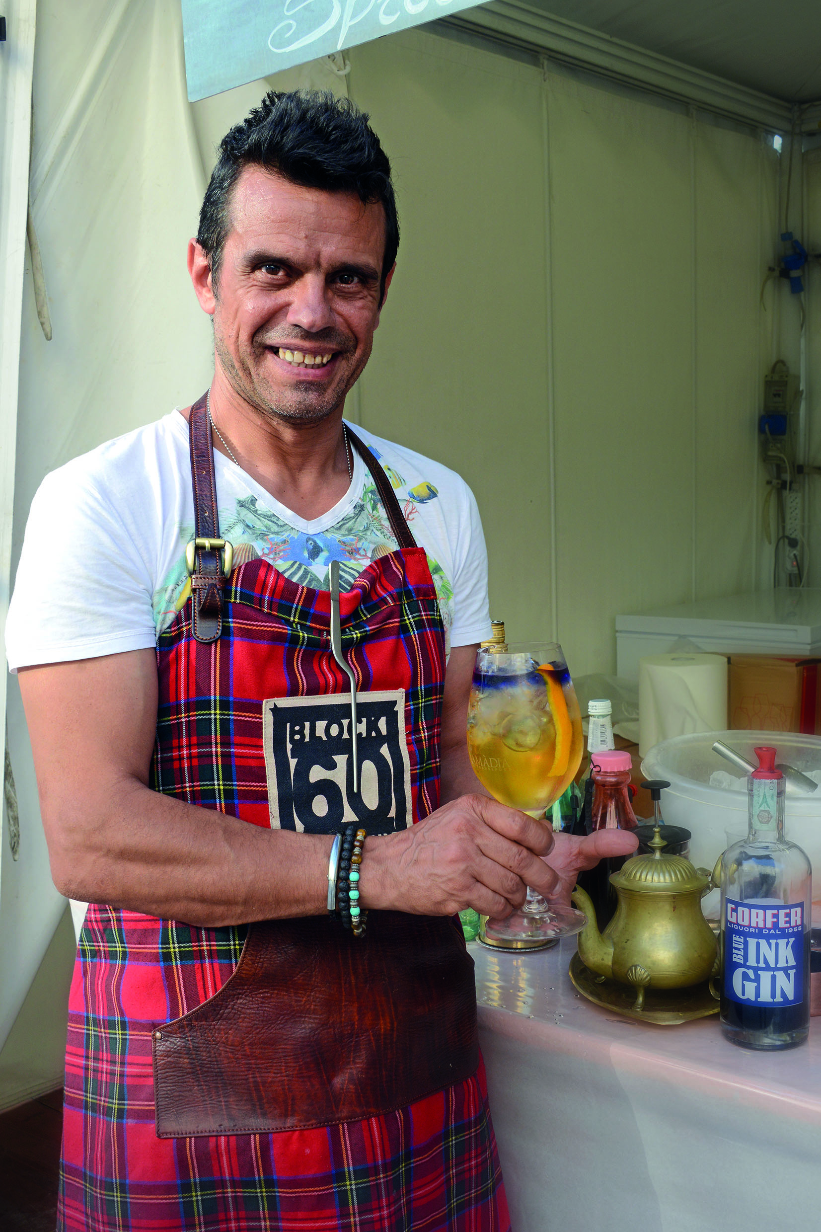 Il bartender Charles Flamminio ha creato il teatonic, un cocktail delicato ed elegante con una sospensione di Inkgin, che regala il colore blu violaceo alla superficie.