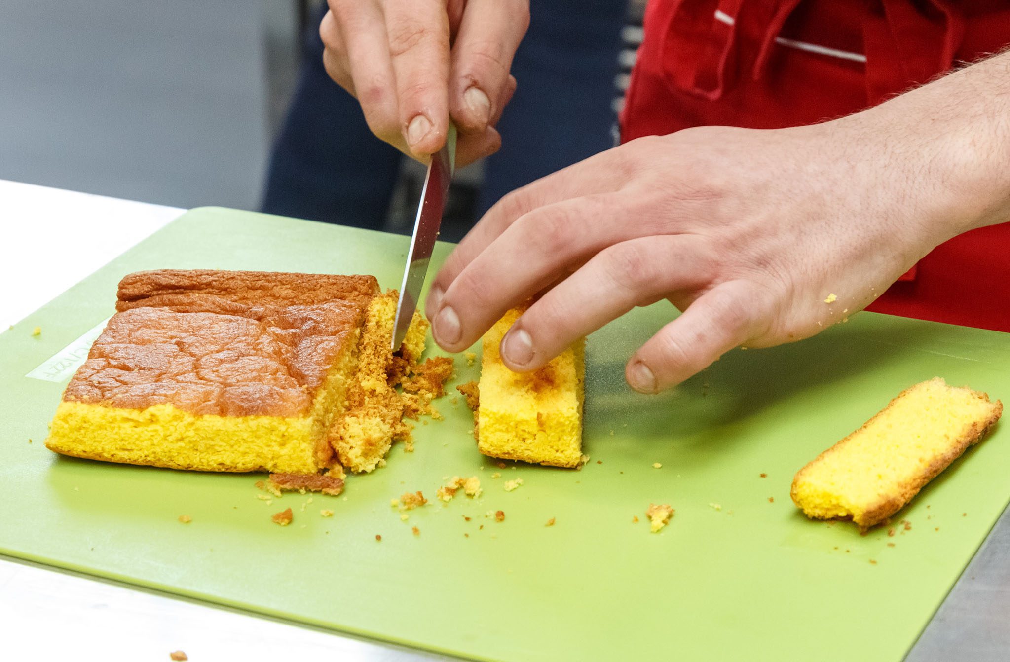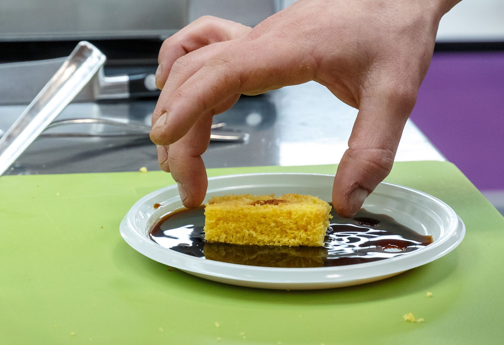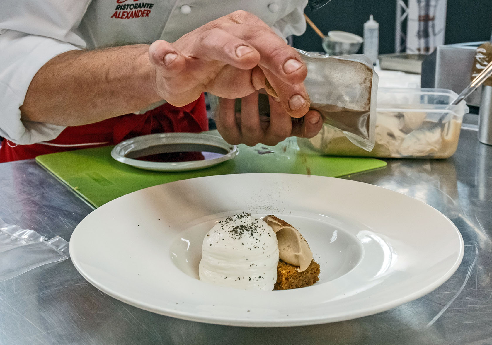 Infine, per l’impiattamento, prendiamo il nostro pan di spagna e lo inzuppiamo nel caffè d’orzo, aggiungere la quenelle di cioccolato bianco e la spuma di squacquerone, quindi, concludendo, spolverare con il the verde.