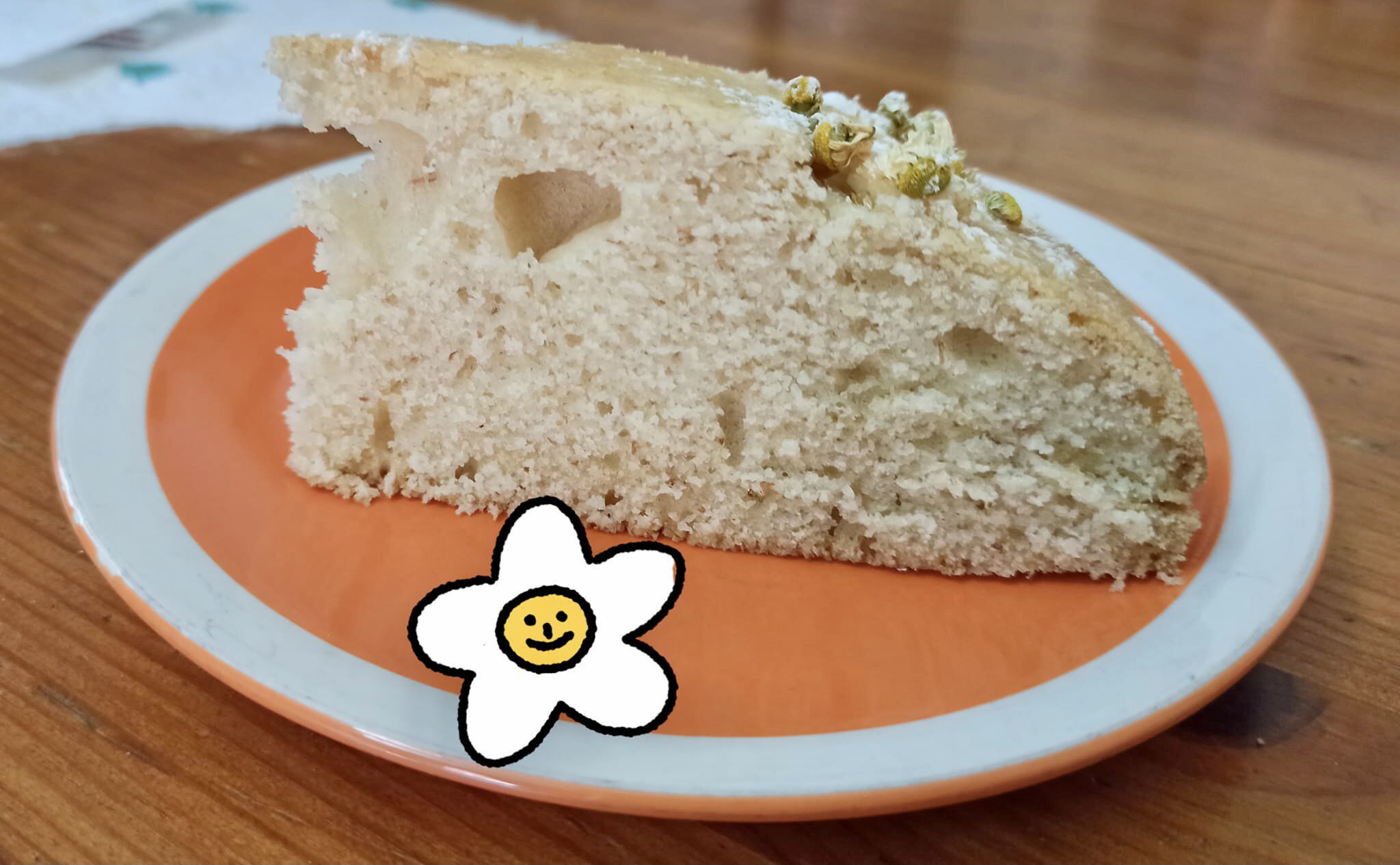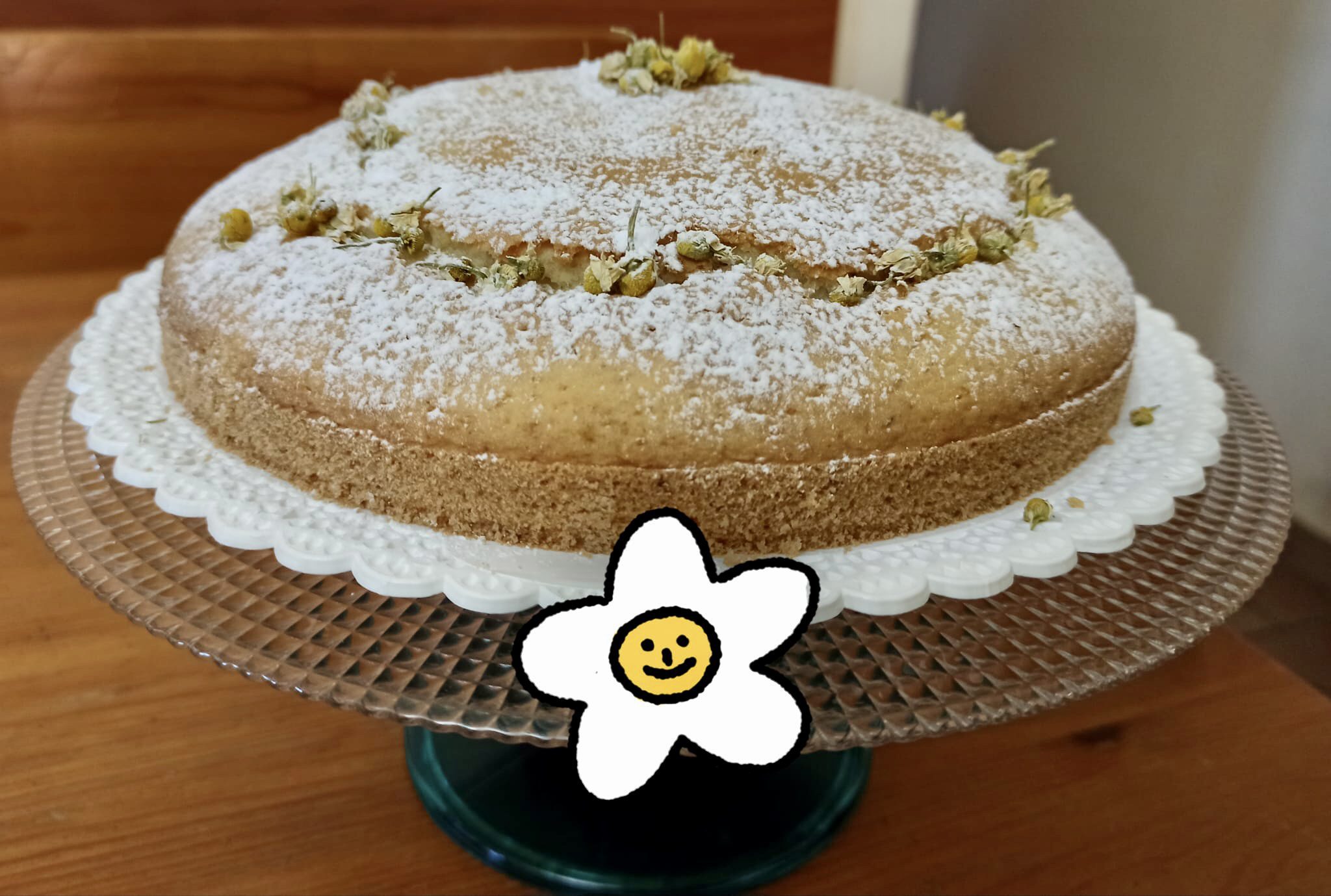 Si può osservare che si saranno formate delle crepe sulla superficie, ma non è un problema. Su queste si possono mettere dei fiori essiccati di camomilla per abbellire la torta. A questo punto, spolverare anche con zucchero a velo se preferite.