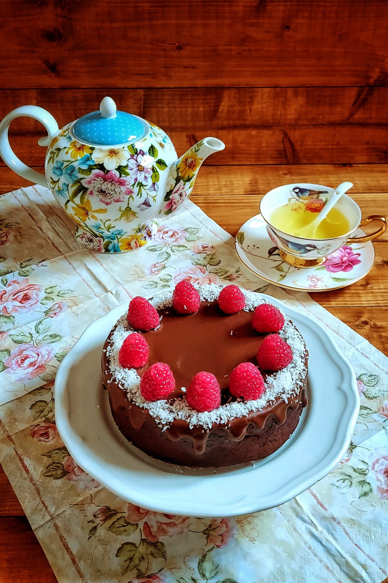 Spalmare la crema sulla torta e decorare con delle scaglie di cocco e dei lamponi.
