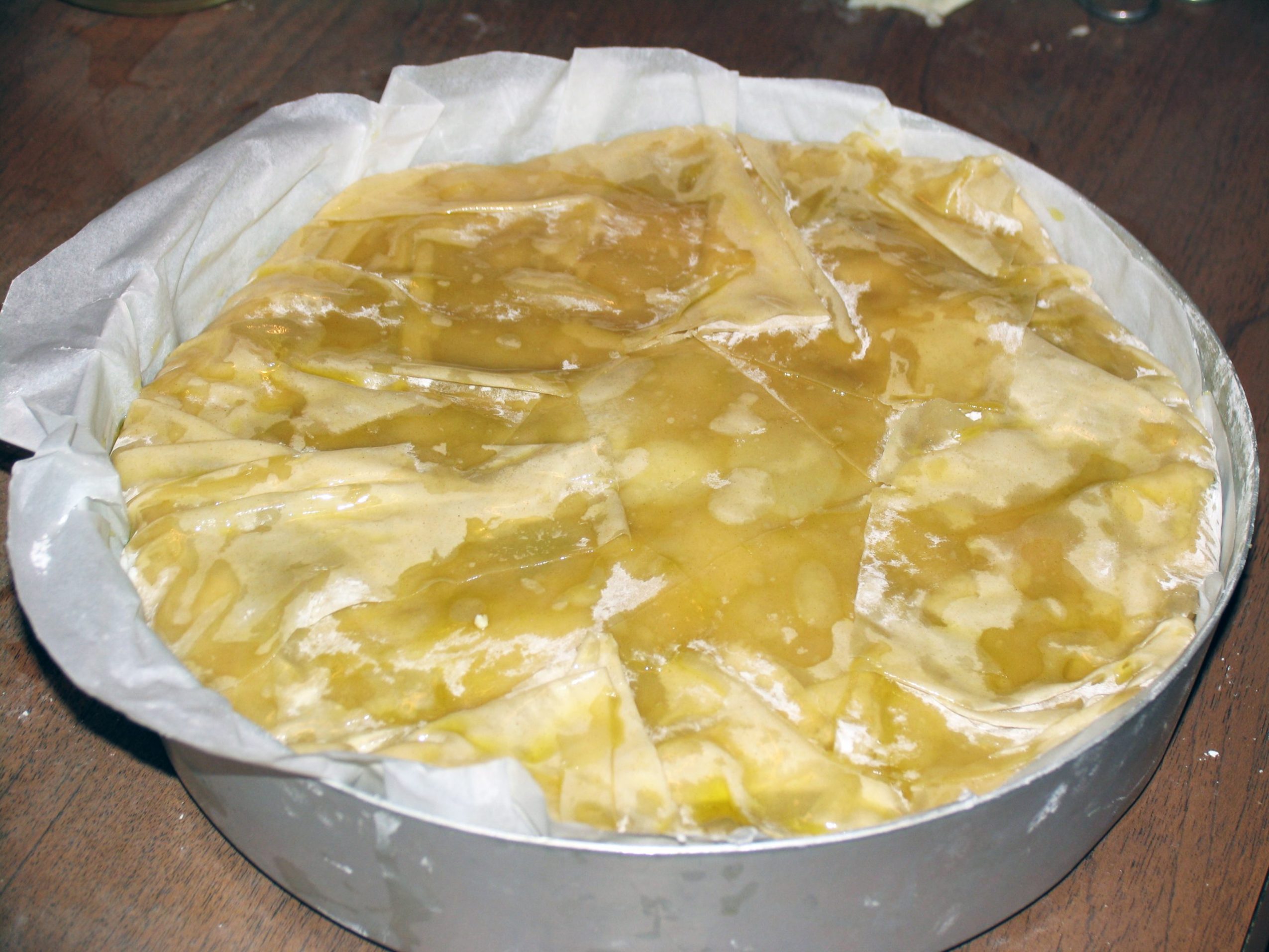 Foderare uno stampo circolare oliato con uno o due pezzi di sfoglia, facendo in modo che escano dal bordo.