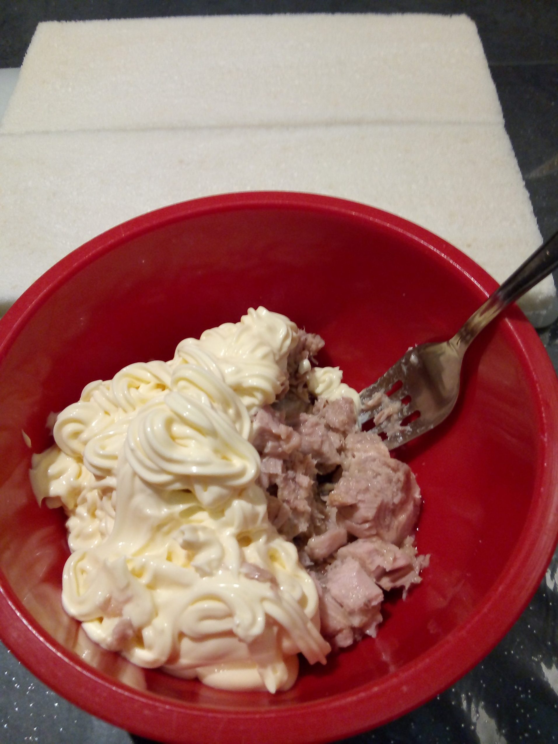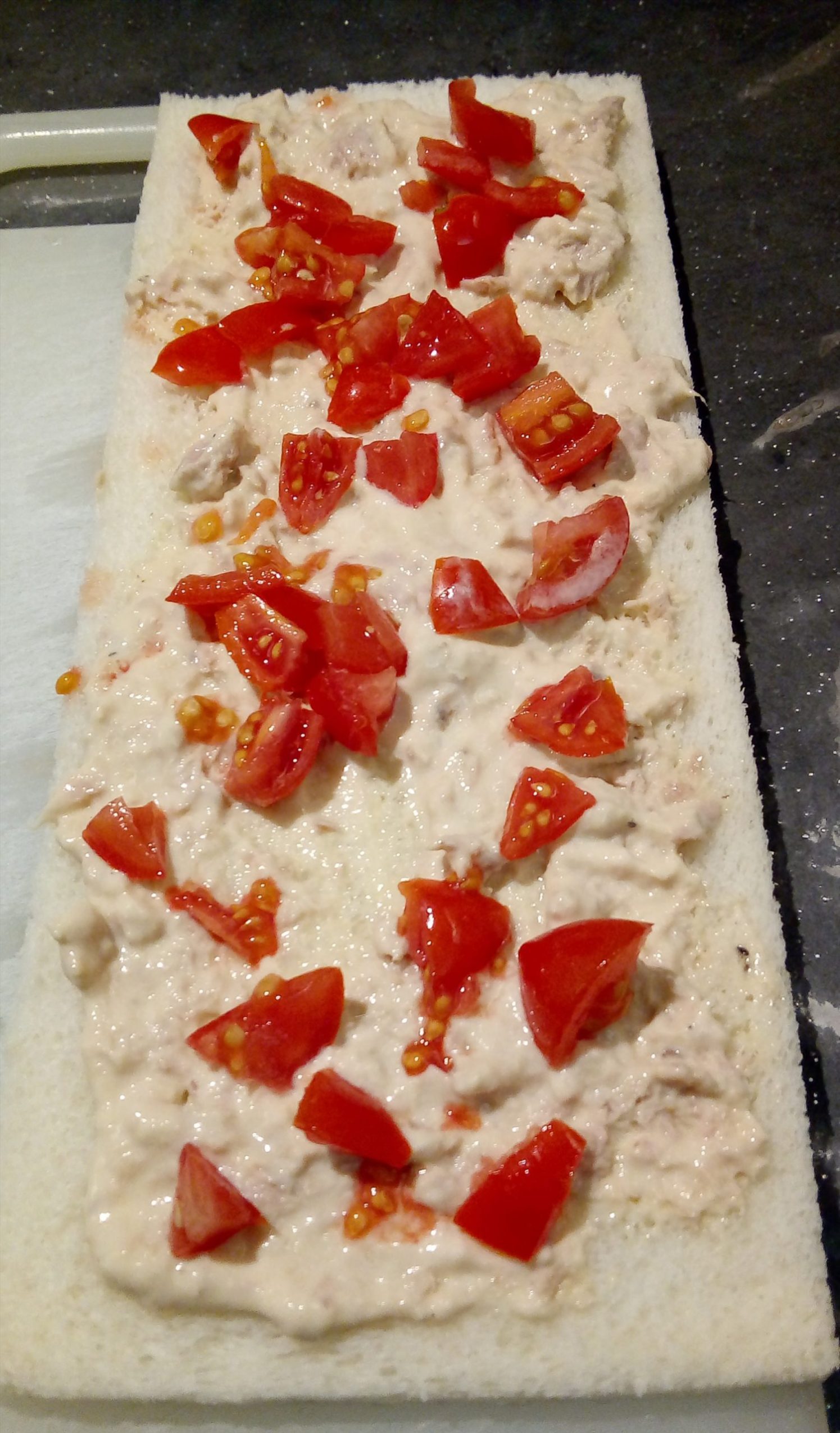Per prima cosa, preparare una crema mescolando il tonno con la maionese e spalmarla sopra alle fette di pane da tramezzini.