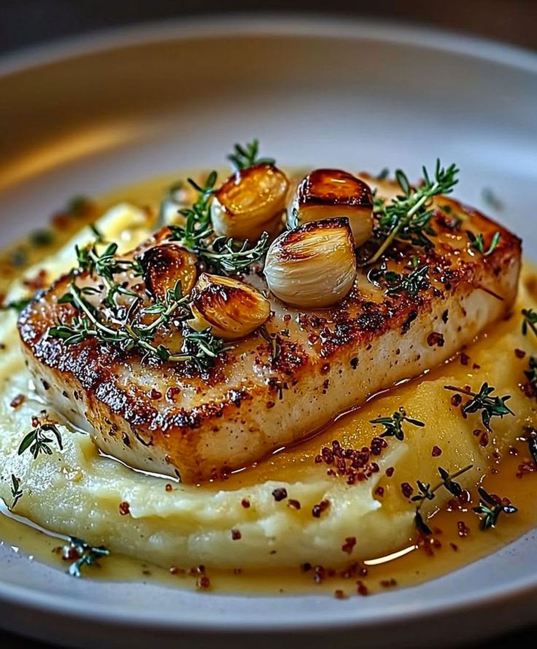 Un trancio di merluzzo, scottato fino a ottenere una superficie dorata e un cuore succoso, adagiato su una crema di patate, risulta essere un secondo piatto completo. L’aglio arrosto portare dolcezza, il timo fresco dare profondità aromatica, la base di crema di patate dona dolcezza e morbidezza.