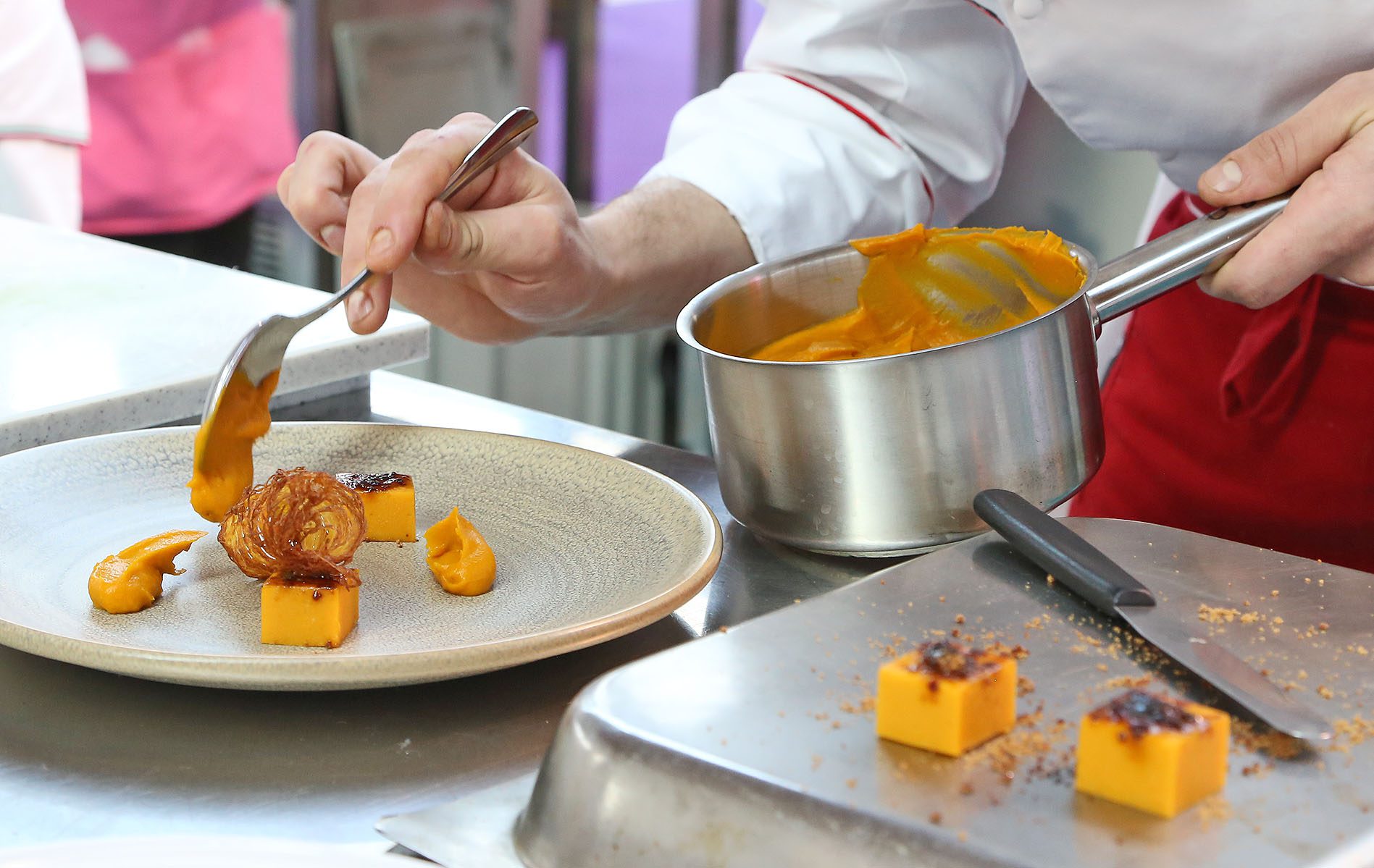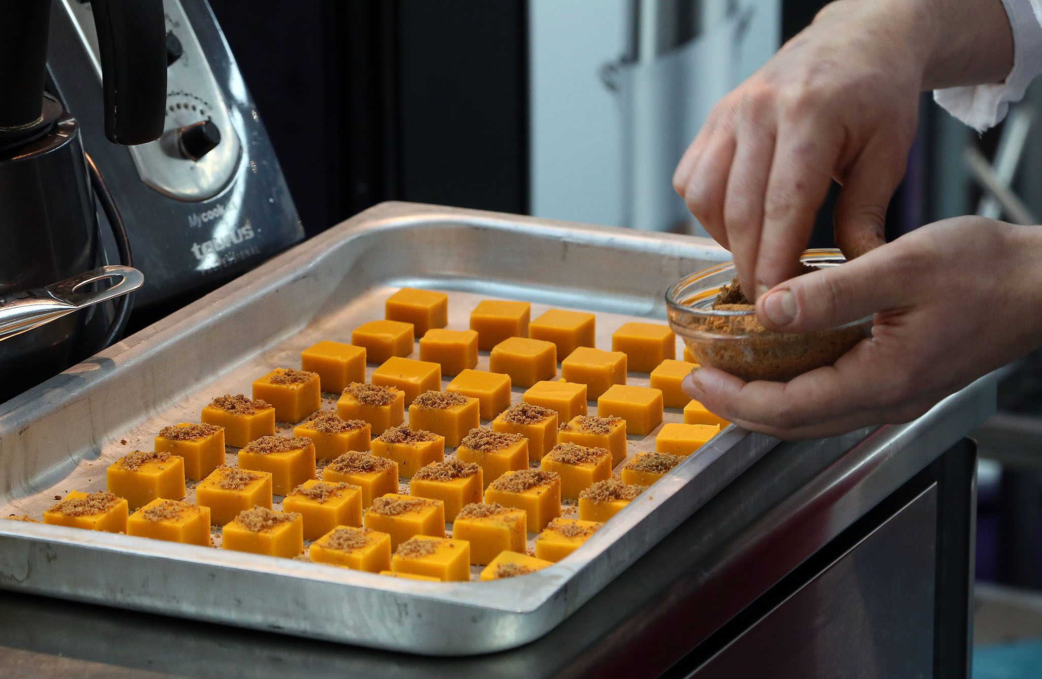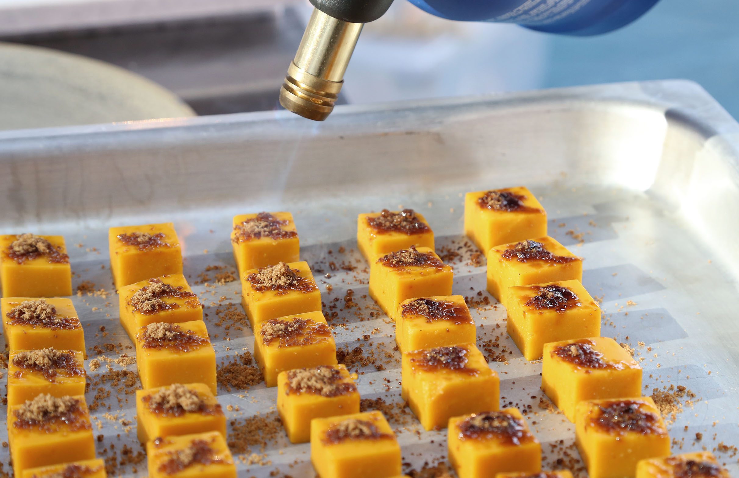 Tagliare la zucca verde (Chayote du Doalnara) a pezzettoni, condirla con olio, sale, pepe e cuocerla in forno o preferibilmente sulla brace. A fine cottura spolparla e frullarla con l’aggiunta di qualche mandorla amara; aggiungere 7 grammi di agar agar per ogni chilogrammo di polpa. Far bollire il tutto in un tegame, stendere l’impasto in una placca e farla gelatinare. Ottenuta la gelatina, tagliarla a cubetti. Spolverare ogni cubetto con lo zucchero moscobado e gratinare con il cannello.