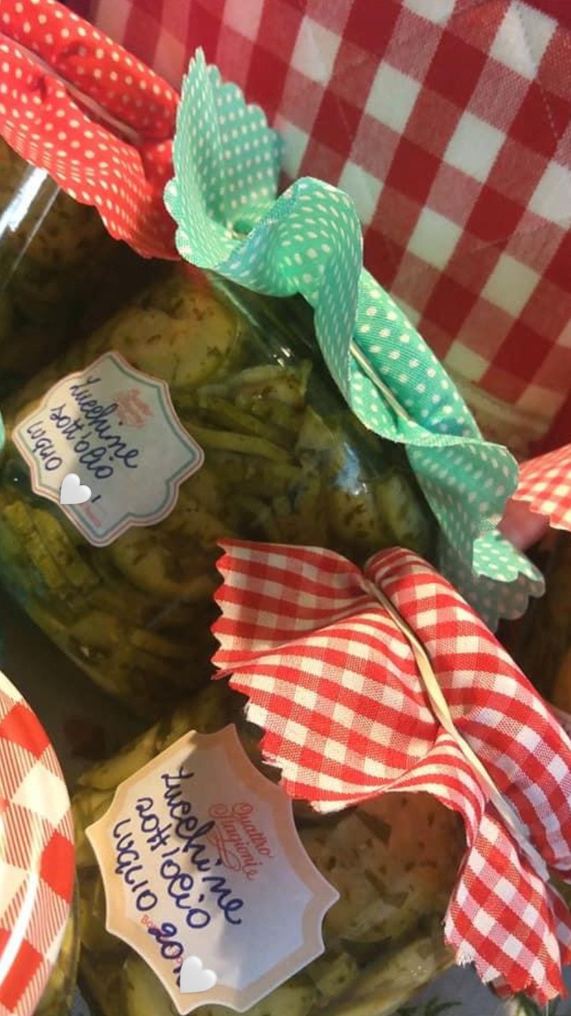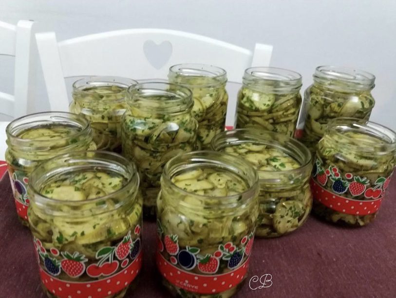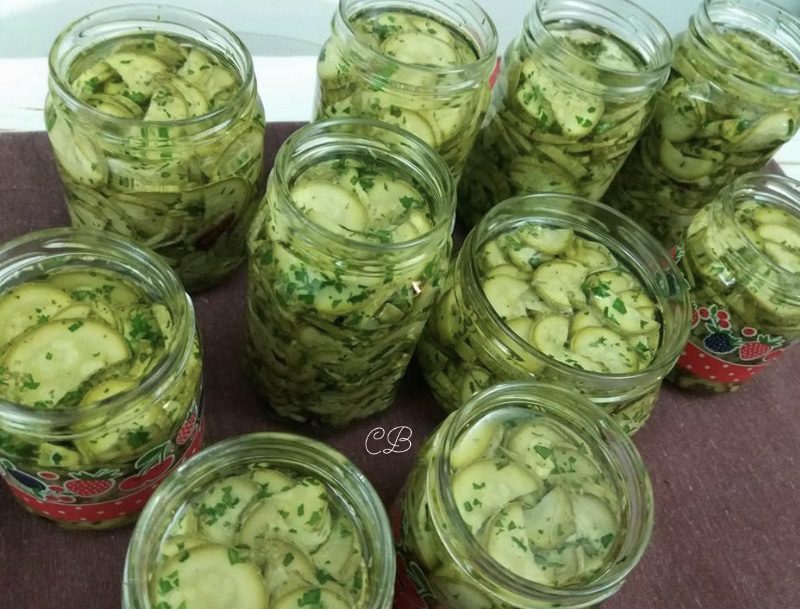 Disporre le zucchine in dei vasi sterilizzati, coprirle con dell’olio di semi di girasole e aggiungere un po’ di peperoncino.