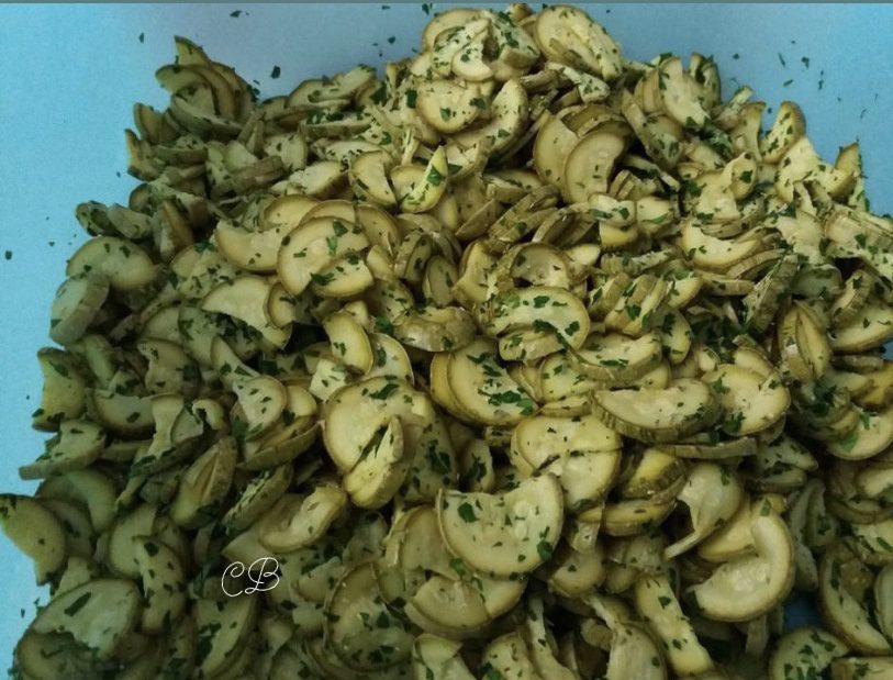 Tritare le foglie di prezzemolo, l’aglio e l’origano e condire le zucchine, amalgamando bene e ricoprendole uniformemente.